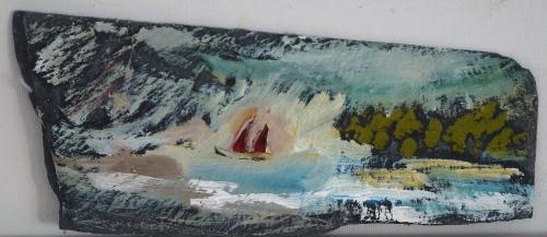 Click image to enlarge The Great Slate Voyage Medium Oil on slate Dimensions 4" x 8" Theme Slate Paintings